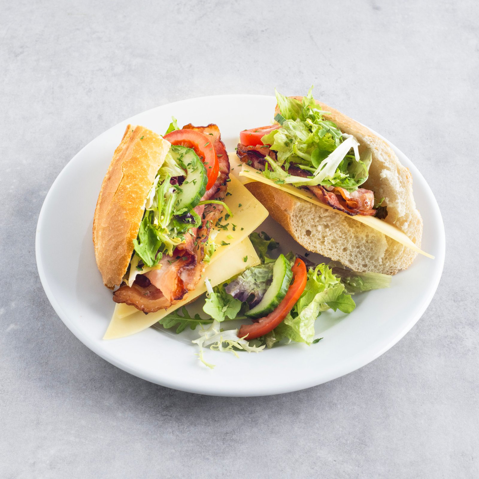Bacon, kaas, chillimayo. Alle broodjes worden belegd met sla, komkommer en tomaat.