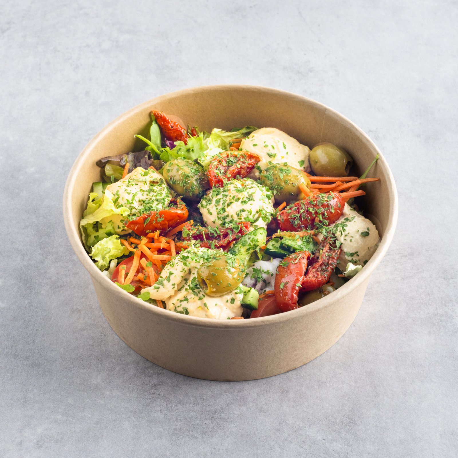 In de salade zit: Hummus, zongedroogde tomaat, olijven, pesto, pijnboompitten.